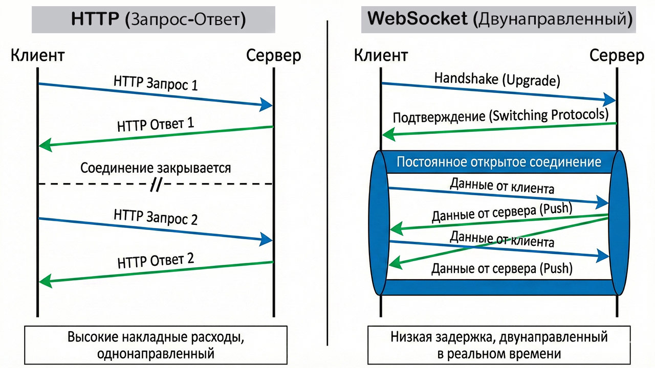 В обычном вебе все инициирует клиент (ваш браузер). Хотите увидеть обновление в чате? Браузер должен спросить сервер: «Есть новые сообщения?». Сервер отвечает. Через секунду браузер снова спрашивает: «А сейчас есть?». Это называется Long Polling (длинный опрос). Это неэффективно, создает задержки и нагружает сервер.