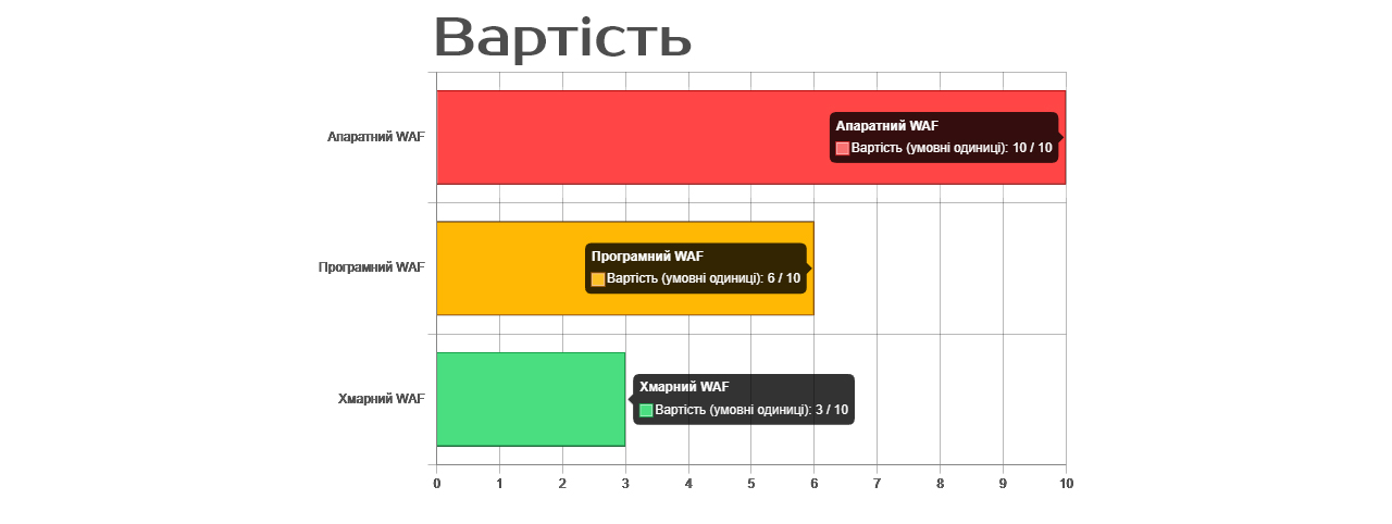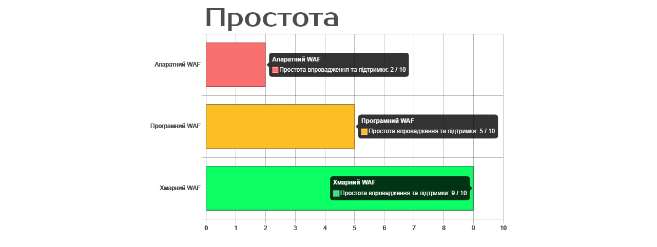 Нижче представлено Порівняння різних типів WAF у вигляді діаграми з розбивкою по Вартості, Простоті та Ефективності.